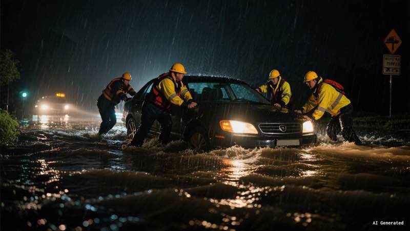 受强降雨影响,西安曲江立交立交桥下积水严重。救援队启动恶劣天气预案,涉水进入没顶车辆,成功转移被困群众并拖离车辆。